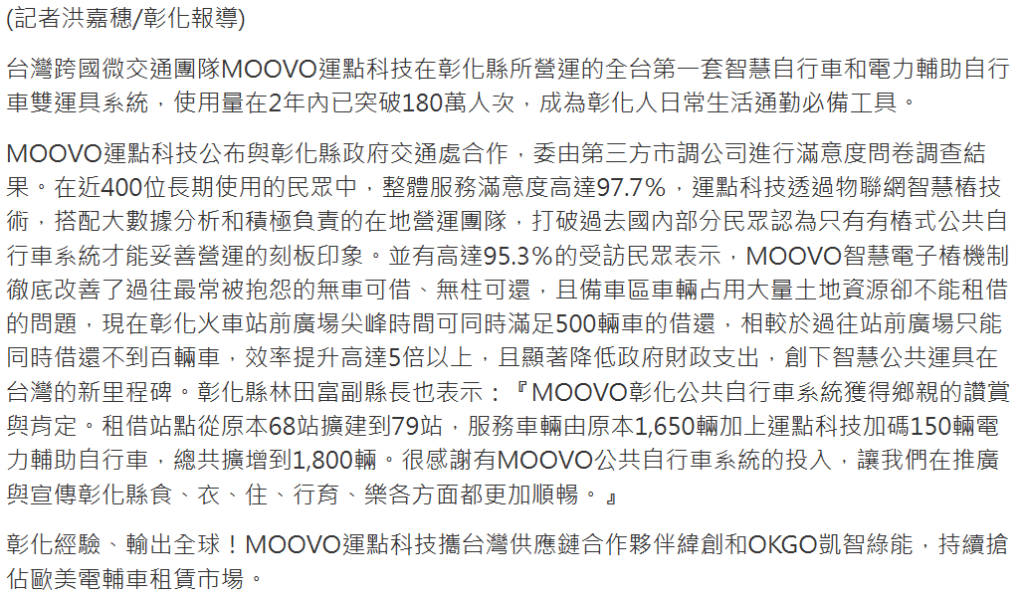 “The MOOVO public bike system has earned high praise and recognition from our citizens. Rental stations have increased from 68 to 79, and the fleet has grown from 1,650 bikes to 1,800 with MOOVO adding 150 new e-bikes. We’re grateful for MOOVO’s contributions, which have enhanced daily life across food, housing, transportation, education, and entertainment in Changhua.”