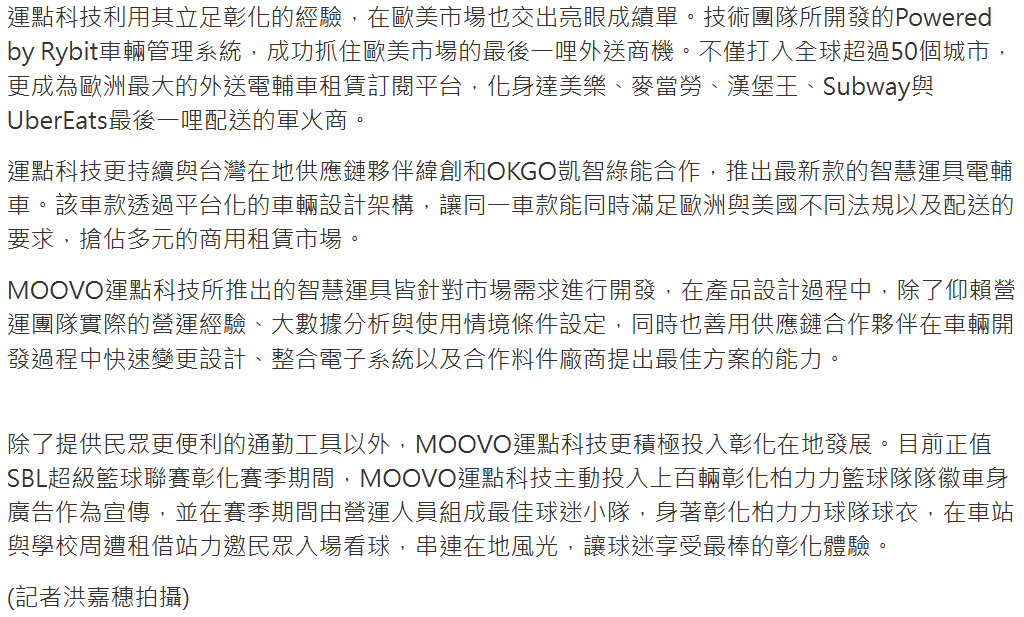 Building on the success in Changhua, MOOVO is now expanding its e-bike rental services globally through partnerships with Taiwanese supply chain leaders Wistron and OKGO Kaichi GreenTech. Leveraging its operational expertise, MOOVO has gained strong traction in the US and European markets.